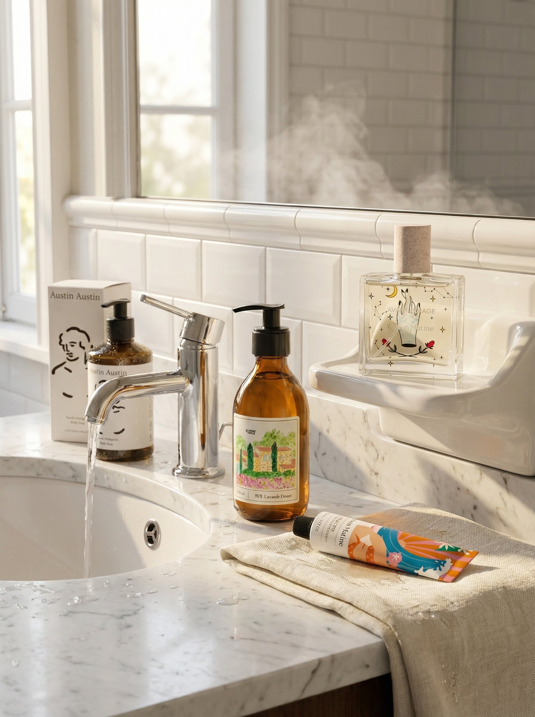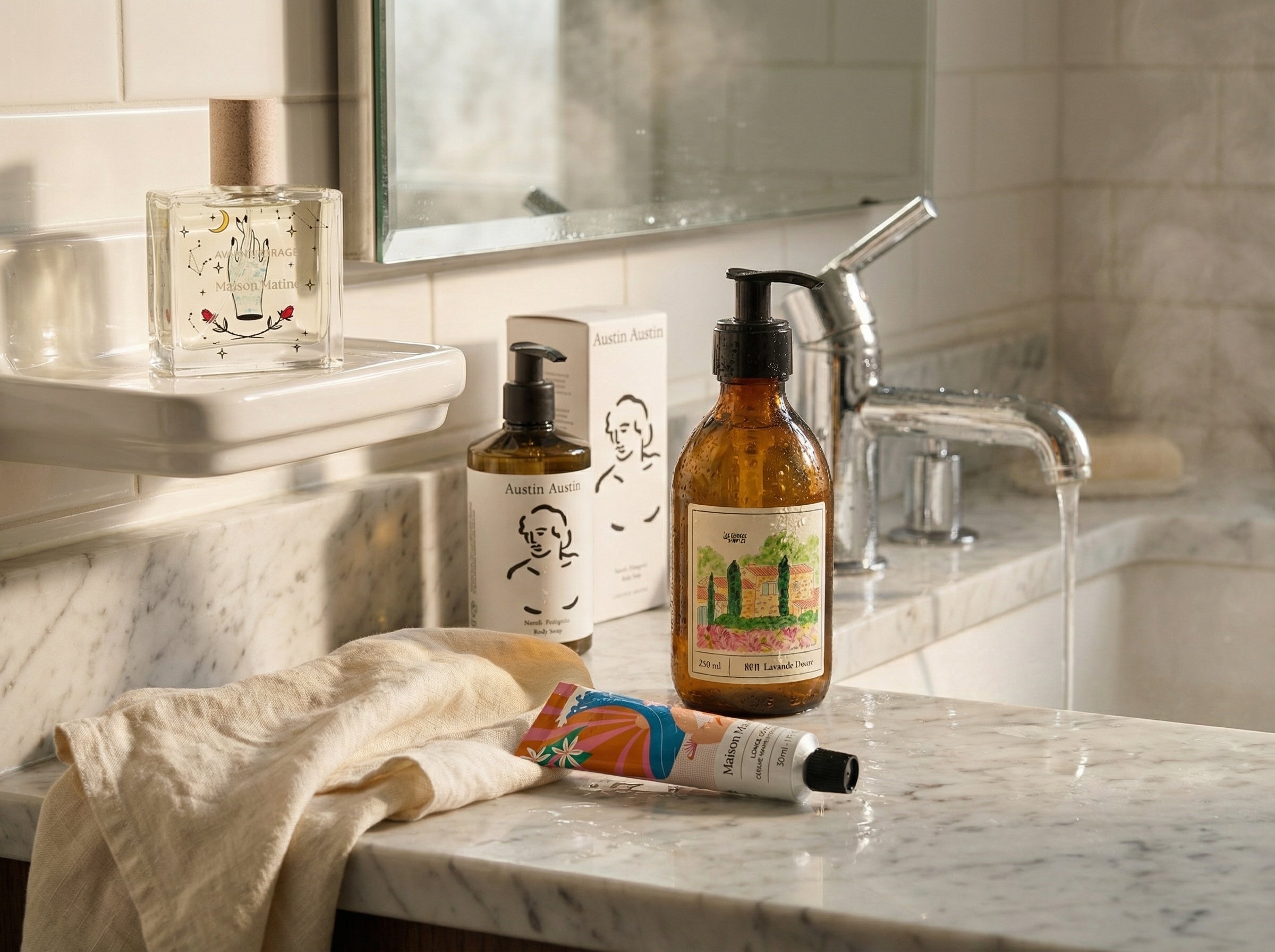 Discover the products featured in this scene — a refined selection of bath and body essentials designed to elevate your daily ritual. Click on each item to explore its story.